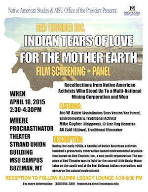 The Red Thunder Oral History Project was born on the campus of the University of Michigan in Ann Arbor in November of 2013, when academic psychologist and Native American Studies professor Joseph P. Gone was invited by the Native American Student Association to speak on a faculty panel on indigenous environmental issues. Dr. Gone shared the history of his own father's, Joseph Azure's, core participation in a grassroots fight against mining at the Ft. Belknap Indian Reservation in the 1990s. The following year, in 2014-15, Dr. Gone was in residence as the Katz Family Chair in Native American Studies at Montana State University in Bozeman. There, he had the generous support of the Native American Studies Program and the Program Head, Dr. Walter Fleming, to convene a panel on Red Thunder and to screen the documentary protest film, Indian Tears of Love, created by Red Thunder member Ali Zaid. Panel members were Red Thunder participants Joe W. Azure, Ali Zaid, and Mike Gopher, son of the now deceased Red Thunder spiritual Adviser Robert Gopher. That convening created such energy that Joe Gone and his partner, the historical researcher, Tiya Miles, proposed to Joe W. Azure that the history of Red Thunder and the group's successful battle to end cyanide heap leach mining in an effort to protect sacred places in the Little Rocky Mountains should be collected and recorded for the purposes of student and public education.